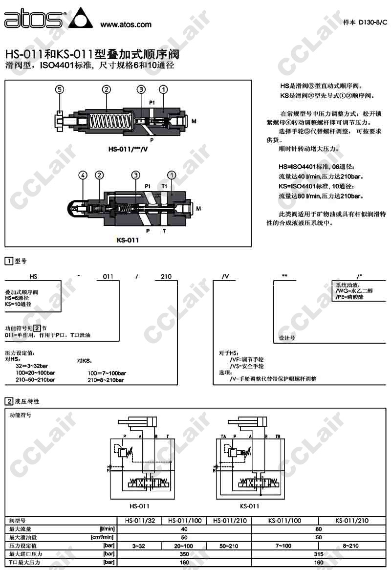 詳細信息 HS-011,HS-011/32/VF,HS-011/100/VF,HS-011/210/VF,HS-011/32/VS,阿托斯ATOS疊加式順序閥