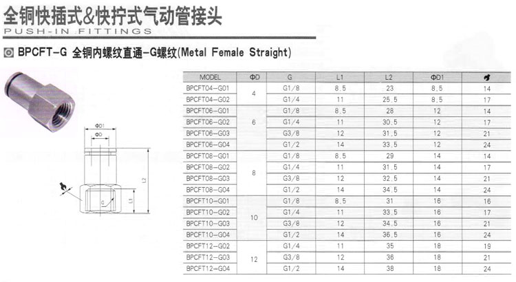 詳細信息 BPCF04-G01,BPCF06-G01,BPCF08-G01,BPCF10-G01,BPCF12-G01,快插式氣動(dòng)管接頭