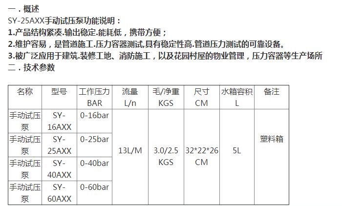 SY-16AXX,SY-25AXX,SY-40AXX,SY-60AXX,液壓手動(dòng)試壓泵
