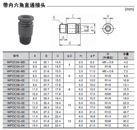 WPOC04-M5,WPOC04-01,WPOC06-M5,WPOC06-01,WPOC06-02,WPOC08-01,WPOC08-02,帶內六角直通接頭