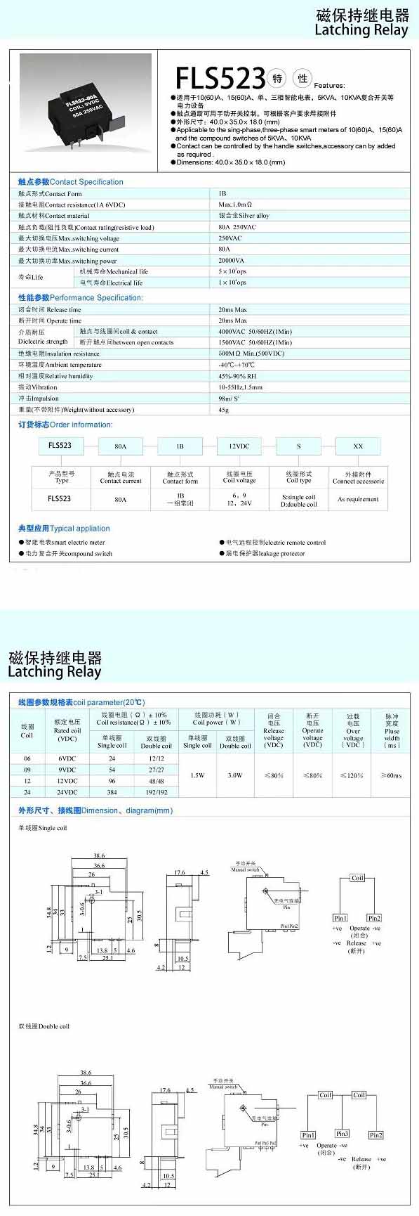 詳細信息 FLS523-80A,磁保持繼電器