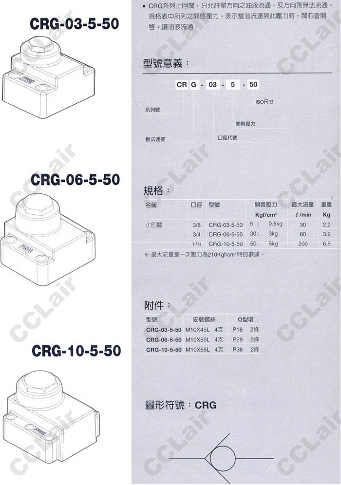 詳細信息 CRG-03-5-50,CRG-06-5-50,CRG-10-5-50,止回閥