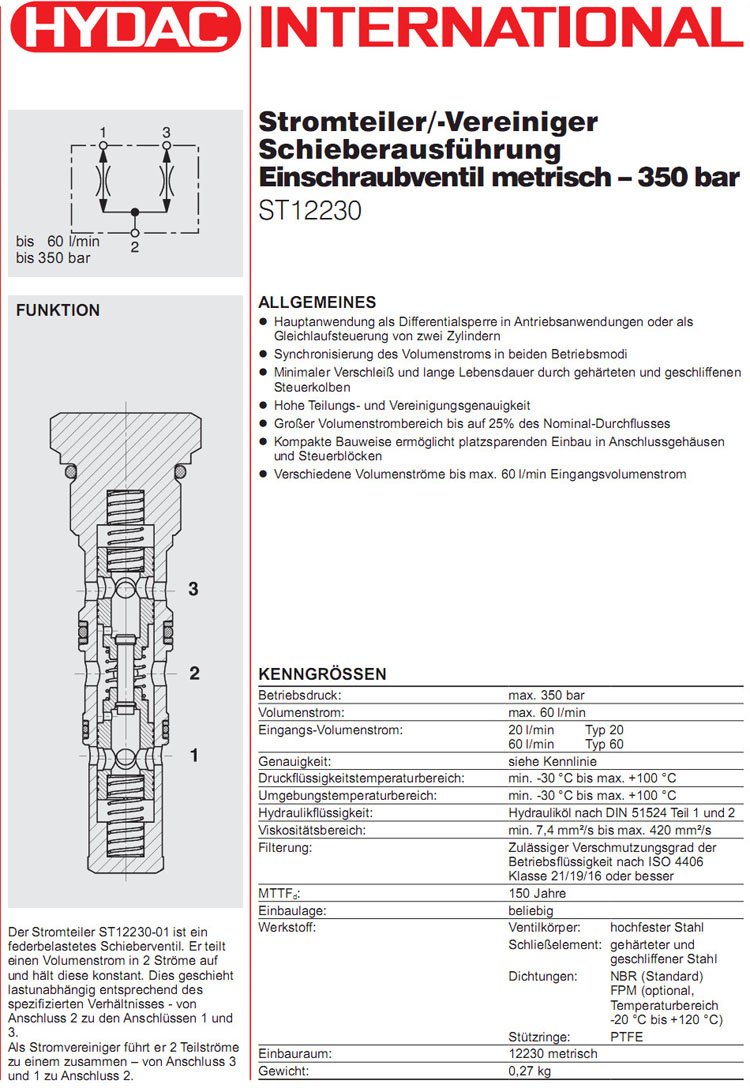 ST12230-01X-20,ST12230-04X-60,HYDAC流量分配/合成器 詳細信息 ST12230-01X-20,ST12230-04X-60,HYDAC流量分配/合成器