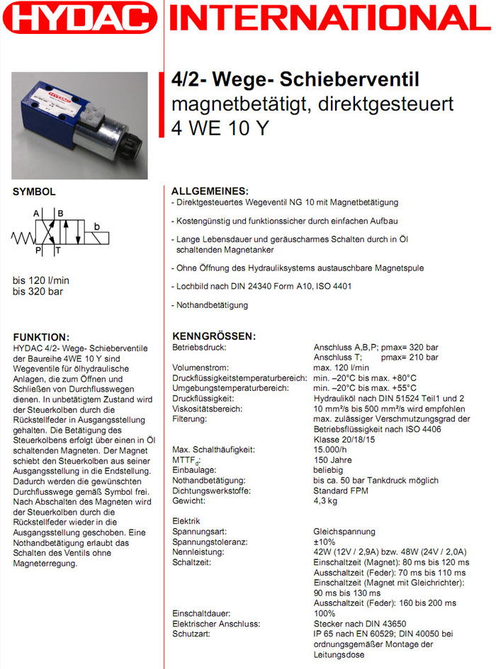首頁(yè) > 產(chǎn)品&解決方案 > 4WE10YS01-12DG/V,4WE10YS01-24DG/V,HYDAC電磁4/2方向滑閥