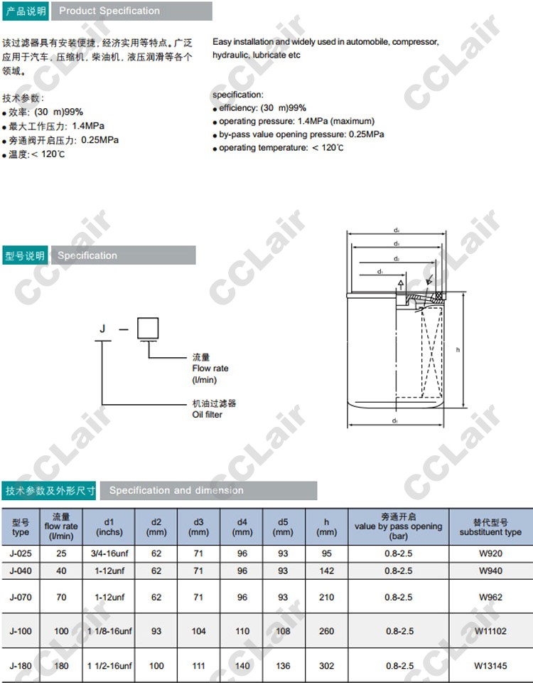 詳細信息 J-025,J-040,J-070,J-100,J-180,旋轉式機油過(guò)濾器
