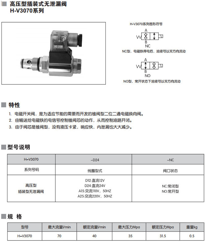 H-V3070-D24-NC,H-V3070-A25-NC,H-V3070-D12-NC,H-V3070-D12-NO,H-V3070-A15-NC,高壓型插裝式無(wú)泄漏閥