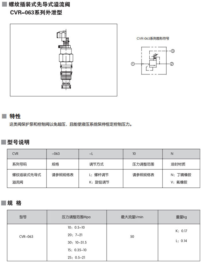 CVR-063-L10N,CVR-063-K10N,CVR-063-L20N,CVR-063-L30N,CVR-063-L1SN,CVR-063-L2SN,螺紋插裝式先導式溢流閥