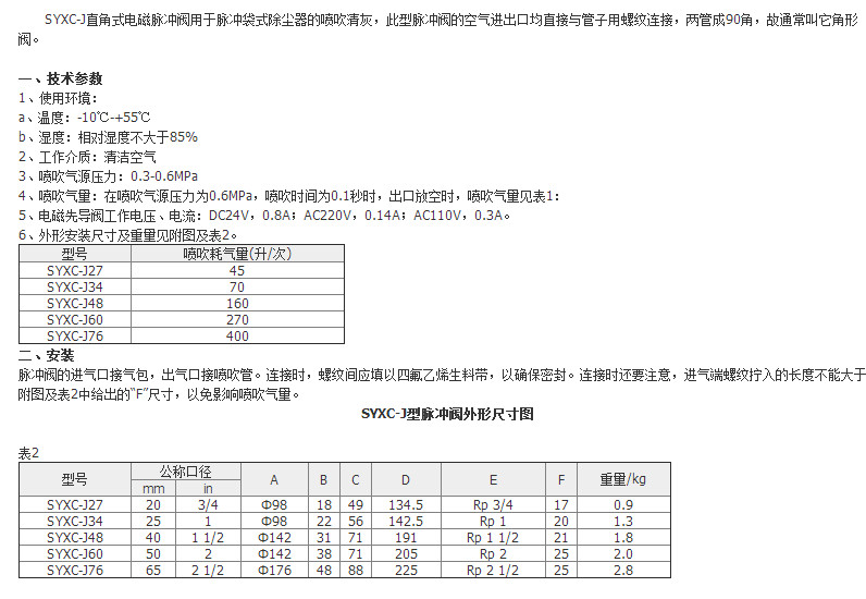 詳細信息 電磁脈沖閥SYXC-J27,SYXC-J34,SYXC-J48,SYXC-J60,SYXC-J76,