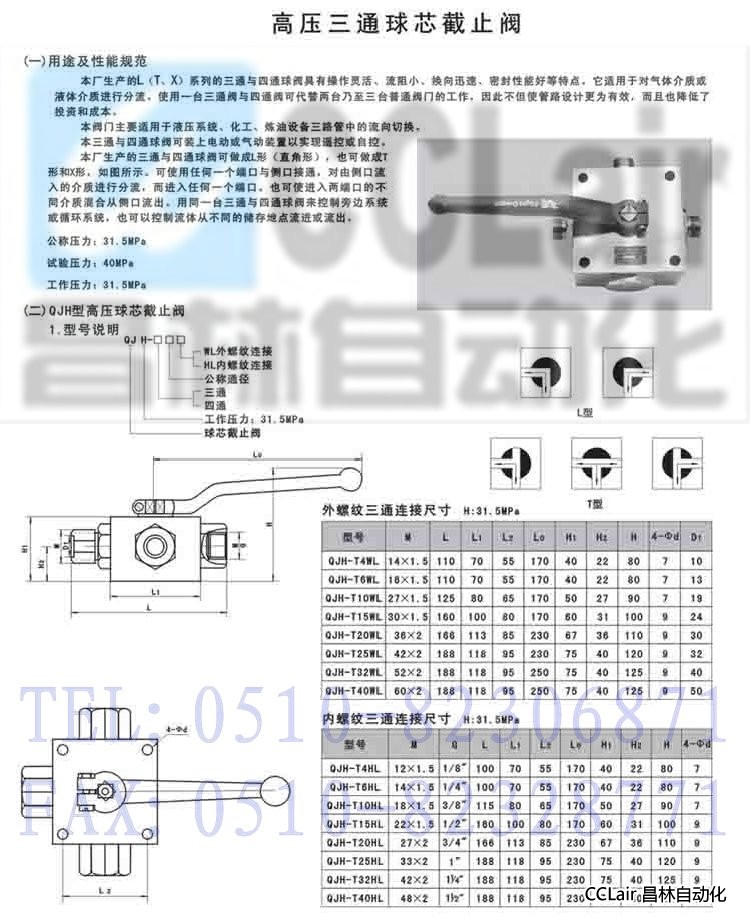 QJH-T4WL,QJH-T6WL,QJH-T10WL,QJH-T15WL,QJH-T20WL,高壓三通球芯截止閥