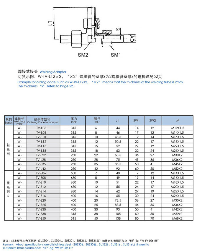 詳細信息 W-TV-L06,W-TV-L10,W-TV-L22,W-TV-L42,W-TV-S30,W-TV-S38,W-TV-S50,三通中間焊接式接頭