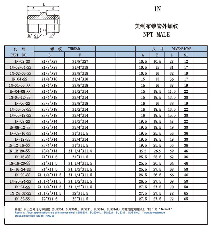 詳細信息 1N-02-SS,1N-04,1N-06,1N-08,1N-12,1N-16,1N-20,1N-32,1N-24,直通外絲接頭