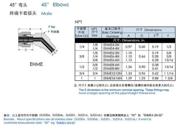 EHME4-2N,EHME4-4N,EHME6-2N,EHME8-8N,EHME12-12N,EHME16-16N,45°終端卡套接頭