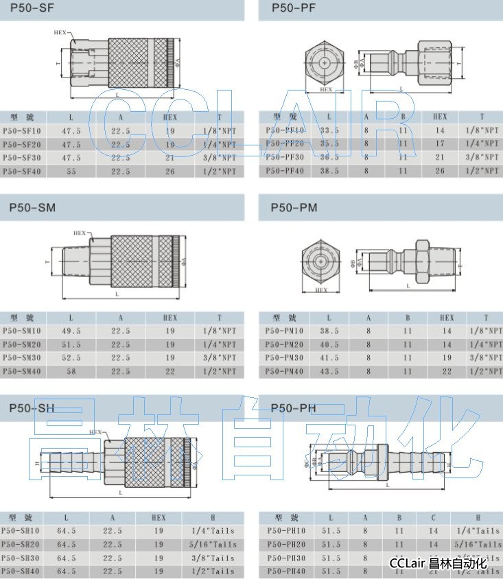 詳細信息 P50-SF10,P50-PF20,P50-SM30,P50-PM40,P50-SH10,P50-PH20,美式快換接頭