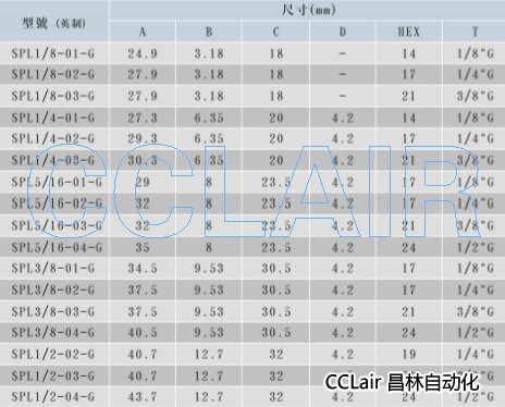 詳細信息 SPL1/8-01-G,SPL1/8-02-G,SPL1/4-02-G,SPL5/16-01-G,SPL3/8-01-G,SPL1/2-04-G,接頭