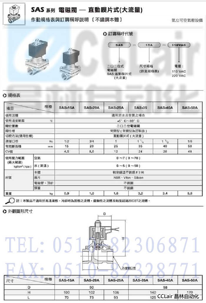 SAS-15A,SAS-20A,SAS-25A,SAS-35,SAS-40A,SAS-50A,直動(dòng)膜片式電磁閥