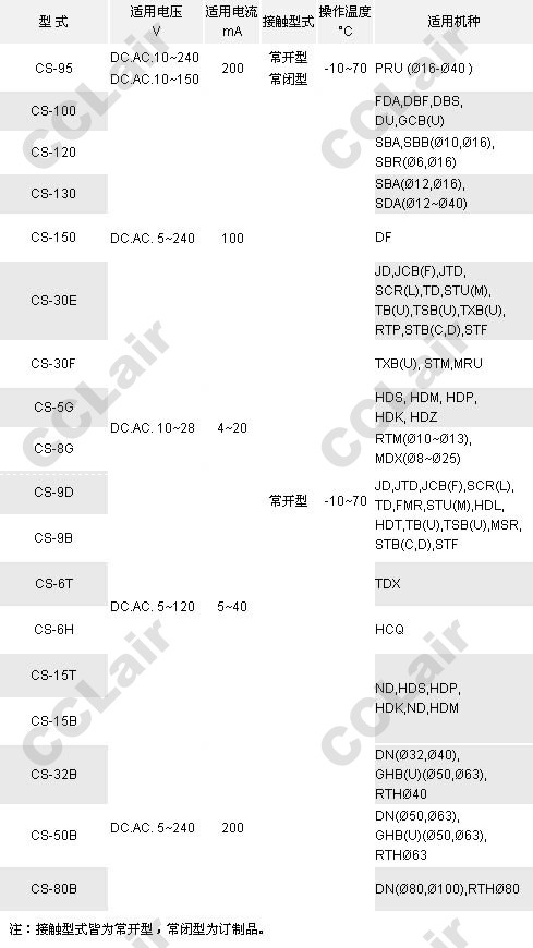 氣立可(chelic),CS-95,CS-100,CS-130,CS-150,CS-30E,CS-30F,CS-5G,CS-8G,CS-9D,CS-9B,CS-6T,氣缸感應器