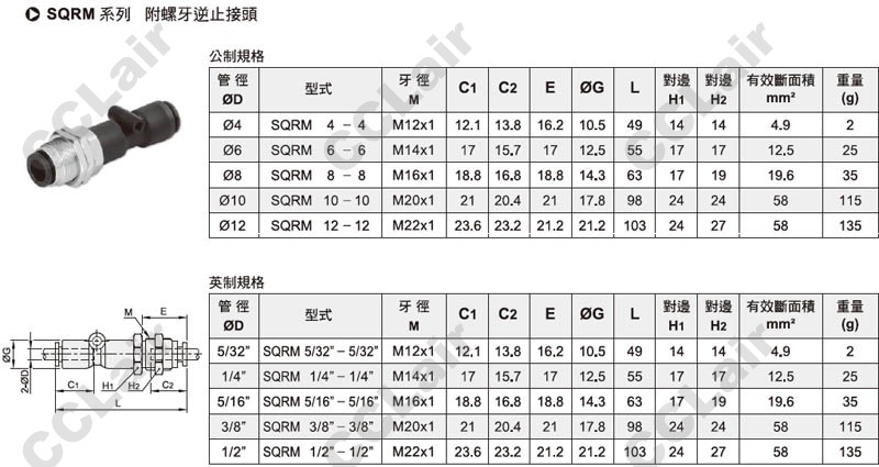 ![]() SQRM5/32-5/32,SQRM1/4-1/4,SQRM5/16-5/16,SQRM3/8-3/8,SQRM1/2-1/2,SQRM6-6,SQRM8-8,SQRM10-10,SQRM12-12,附螺牙逆止接頭