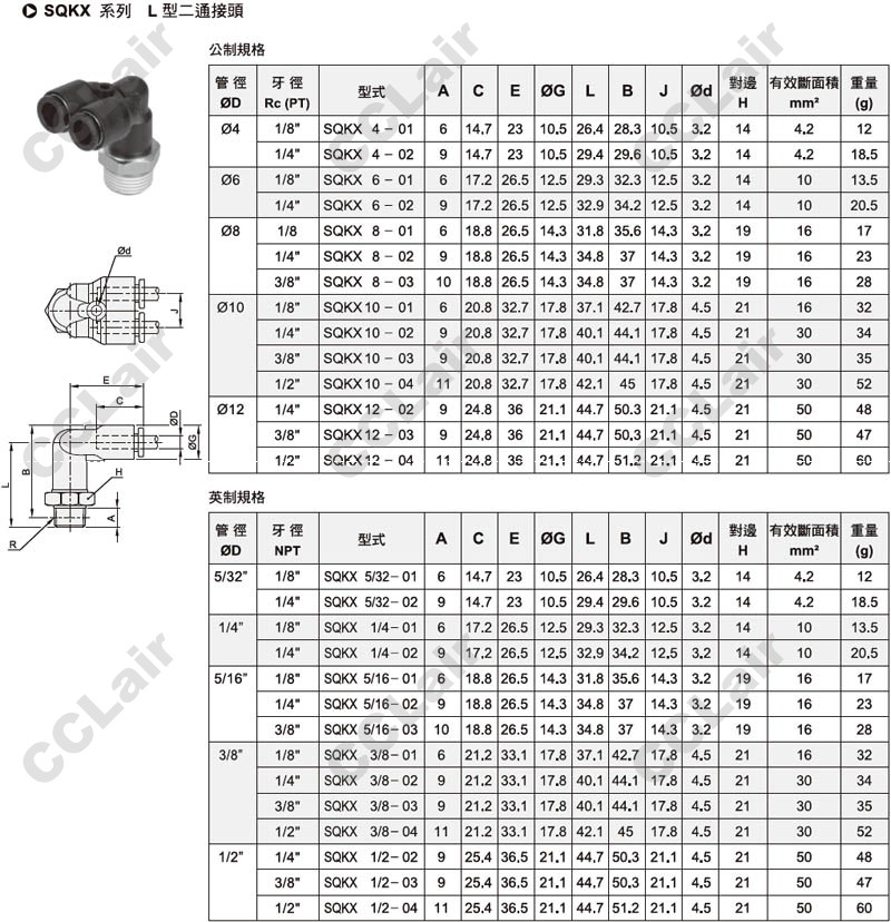 ![]() SQKX4-M5,SQKX4-01,SQKX6-M5,SQKX6-01,SQKX6-02,SQKX8-02,SQKX8-03,SQKX10-02,SQKX10-03,SQKX12-03,SQKX12-04,L型二通接頭