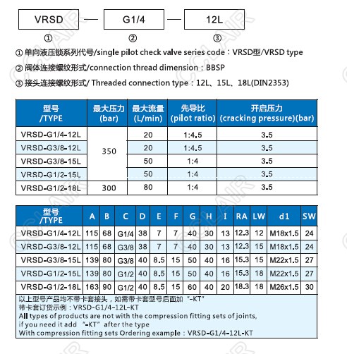 VRSD-G1/4-12L,VRSD-G3/8-12L,VRSD-G3/8-15L,VRSD-G1/2-15L,VRSD-G1/2-18L,VRSD,單向液壓