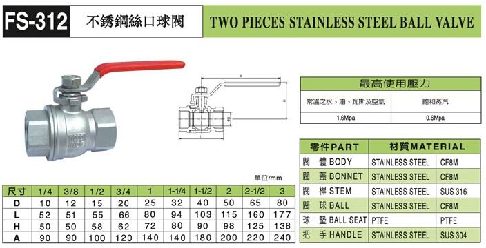 FS312不銹鋼絲口球閥,閥體、球芯全不銹鋼材質(zhì),PTFE密封,理想的環(huán)保產(chǎn)品,避免二次污染,再生利用價(jià)值大,不生銹、耐腐蝕。