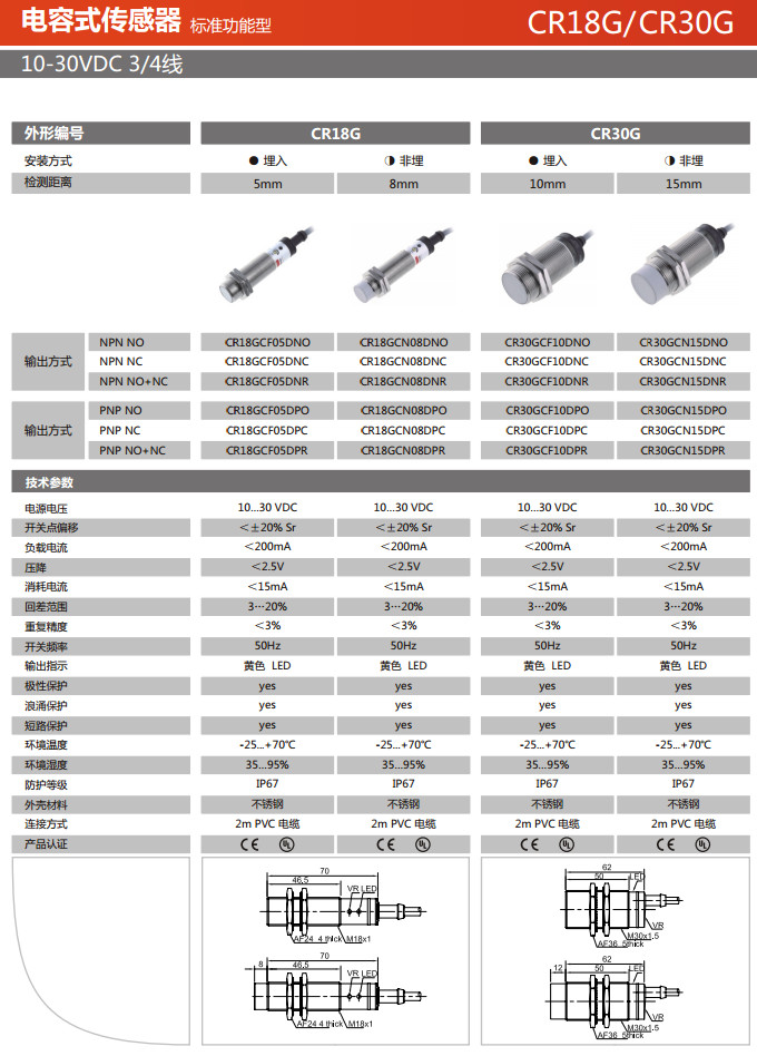 詳細信息 CR18GCF05DNO,CR18GCF05DNC,CR18GCF05DNR,CR30GCF10DNO,CR30GCF10DNC,CR30GCF10DNR,電容式傳感器