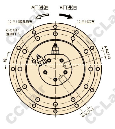 | 型 號 | 扭矩N.m | 轉速范圍r/min | 傳動(dòng)比 | 壓力Mpa | 總排量 | 液壓馬達 | 總重 | 適用機重ton | ||||