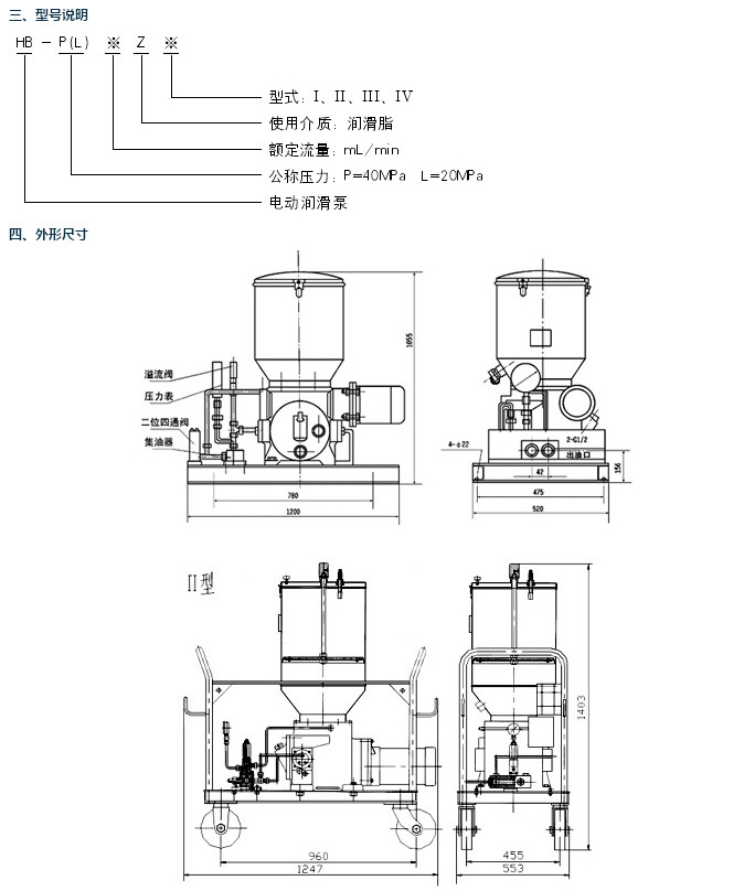 ZRB-P系列電動(dòng)潤滑泵適用于潤滑點(diǎn)多、分布范圍廣、給油頻率高、公稱(chēng)壓力為40(20MPa)的單、雙線(xiàn)干(稀)油集中潤滑系統中,作為供送潤滑劑的裝置,還可配備移動(dòng)小車(chē)、膠管、油槍及電纜組成移動(dòng)式電動(dòng)潤滑泵裝置以便用于給油頻率低,潤滑點(diǎn)少,給油量大且不便于采用集中潤滑的單機設備,進(jìn)行移動(dòng)給油,貯油桶還設有油位自動(dòng)報警裝置,如配以相應的電氣控制箱還可實(shí)現自動(dòng)控制,并對系統進(jìn)行監視。