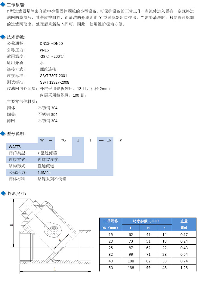 W-YG11-16P-DN15,W-YG11-16P-DN20,W-YG11-16P-DN25,不銹鋼螺紋Y型過(guò)濾器