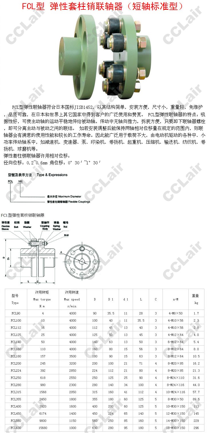 詳細信息 FCL90,FCL100,FCL112,FCL125,FCL200,FCL224,FCL250,FCL280,FCL315,FCL450,FCL560,FCL630,彈性套柱銷(xiāo)聯(lián)軸器
