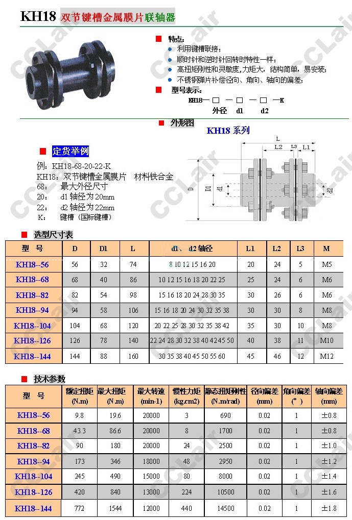 KH18-56,KH18-68,KH18-82,KH18-94,KH18-104,KH18-126,KH18-144,雙節鍵槽金屬膜片聯(lián)軸器