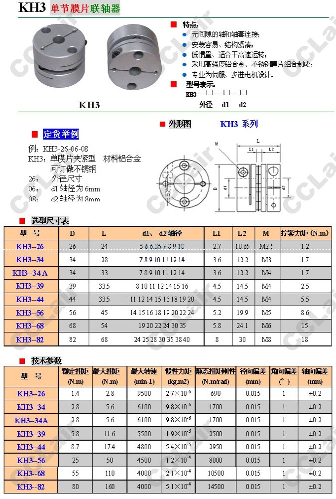 KH3-26,KH3-34,KH3-34A,KH3-39,KH3-44,KH3-56,KH3-68,KH3-82,鋁合金單節膜片聯(lián)軸器
