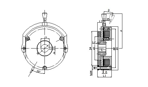 該系列電磁失電安全制動(dòng)器主要由勵磁部分(磁軛1、線(xiàn)圈2、彈簧3、銜鐵4)、制動(dòng)盤(pán)7、花鍵套8等主要零部件組成。勵磁部分通過(guò)安裝螺栓6安裝在機座上,旋轉安裝螺栓6調整氣隙至初始安裝氣隙推薦值δ后(見(jiàn)安裝尺寸參數表),反向旋出空心螺栓5,頂緊勵磁部分?;ㄦI套通過(guò)矩形花鍵與傳動(dòng)軸相連;制動(dòng)盤(pán)7與花鍵套8通過(guò)漸開(kāi)線(xiàn)花鍵嚙合。當線(xiàn)圈斷電時(shí),在彈簧力的作用下,制動(dòng)盤(pán)7與銜鐵4、機座9端面產(chǎn)生摩擦力,通過(guò)花鍵套8傳給傳動(dòng)軸,使軸制動(dòng)。當線(xiàn)圈通電后,在電磁力作用下,銜鐵4被吸向磁軛1,使制動(dòng)盤(pán)7松開(kāi),傳動(dòng)軸制動(dòng)解除。