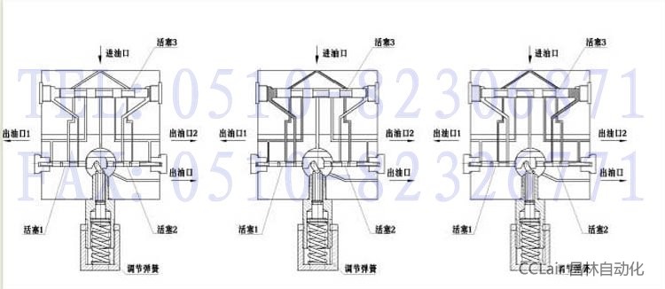 當活塞1、活塞2移到閥體右端后(圖3),活塞3左側與回油口通,壓力油經(jīng)活塞2內腔道作用在活塞3的右側,推動(dòng)活塞向左移動(dòng)到達閥體左側。此時(shí)活塞3右腔內壓力油經(jīng)出油口2流出,而左端的壓力油被活塞1封死。當活塞2右端壓力(出口壓力)克服彈簧對活塞的作用后,活塞2右移,同時(shí)活塞1右移。當活塞1、活塞2移到閥體左端后,活塞3右側與回油口通,壓力油經(jīng)活塞1內腔道作用在活塞3的左側,推動(dòng)活塞向右移動(dòng)到達閥體右側(圖1),完成一個(gè)工作循環(huán)。
