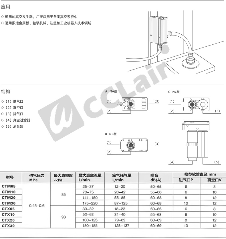 CTM05/10-A CTM05/10/20/30-B/C CTX05/10-A CTX05/10/20/30-B/C VTM05/10-A VTM05/10/20/30-B/C VTX05/10-A VTX05/10/20/30-B/C.CTM高流量型多級真空發(fā)生器 詳細信息 多級高真空型發(fā)生器的工作原理是利用噴管高速?lài)娚鋲嚎s空氣,?在噴管出口形成射流,?產(chǎn)生卷吸流動(dòng)。?這種工作原理使得噴管出口周?chē)目諝獠粩嗟乇怀槲撸?從而使吸附腔內的壓力降至大氣壓以下,?形成一定真空度。