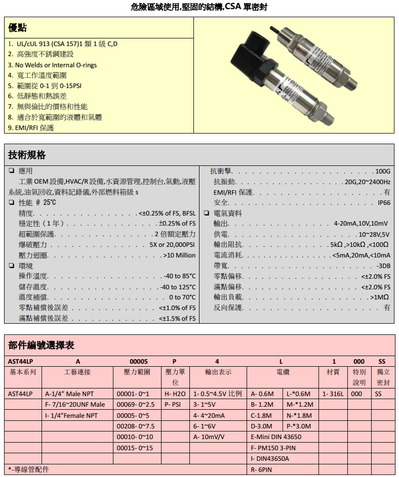 AST44LP-A-00001-H,AST44LP-I-00069-H,AST44LP-I-00005-P,防爆壓力傳感器