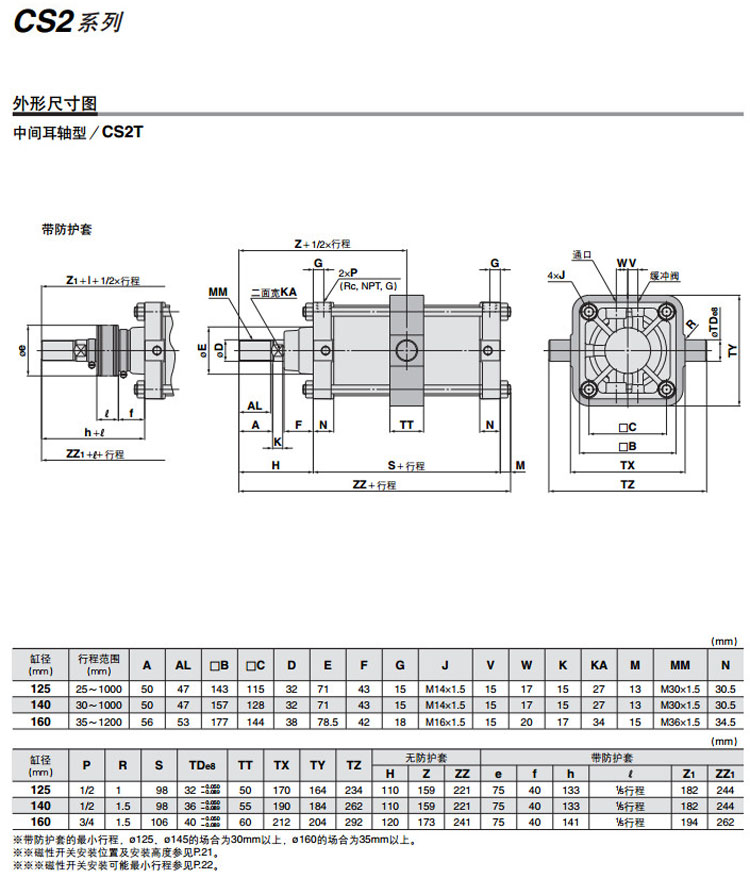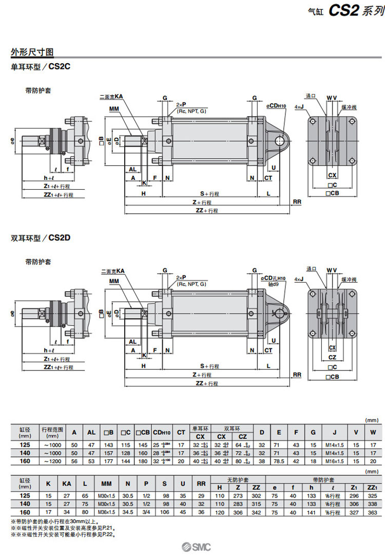 CS2B125-300,CS2L125-300,CS2F125-300,CS2G125-300,CS2C125-300,CS2D125-300,CS2T125-300,SMC低摩擦型氣缸