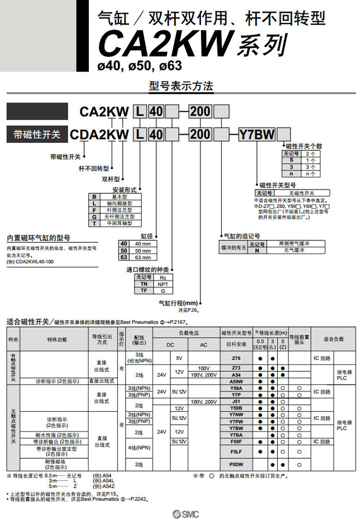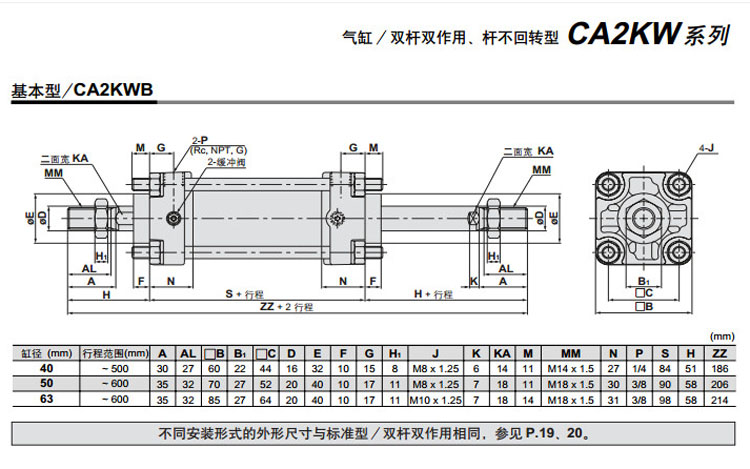 CDA2KWT40-500,CDA2KWT50-500,CDA2KWT63-500,CDA2KWB50-600,CDA2KWB63-600,CDA2KWL50-600,CDA2KWL63-600,SMC桿不回轉型氣缸