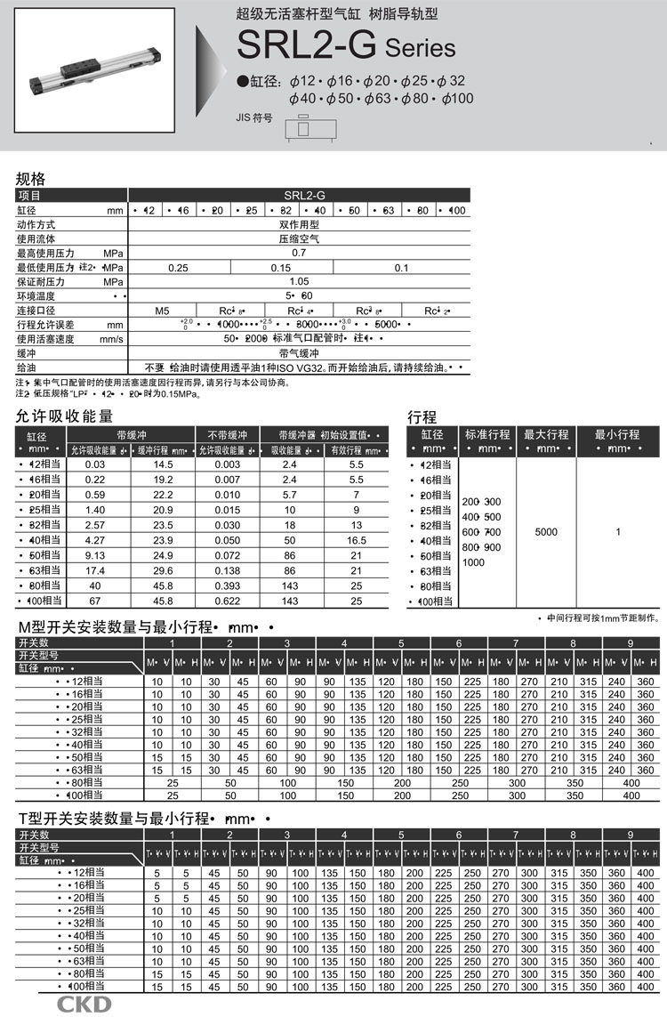 SRL2-G-LB1-25B-200,SRL2-G-LB1-25B-300,SRL2-G-LB1-25B-400,SRL2-G-LB1-25B-500,SRL2-G-LB1-25B-600,CKD超級無(wú)活塞桿型氣缸