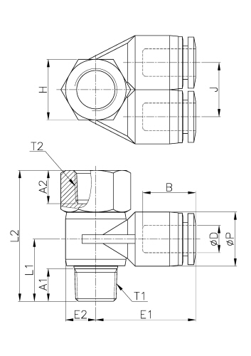 | Model | ¢D | ¢P | T1 | T2 | L1 | L2 | J | E1 | E2 | A1 | A2 | B | H(Hex) | ORIFICE | WEIGHT(g) | BOX(EA) |