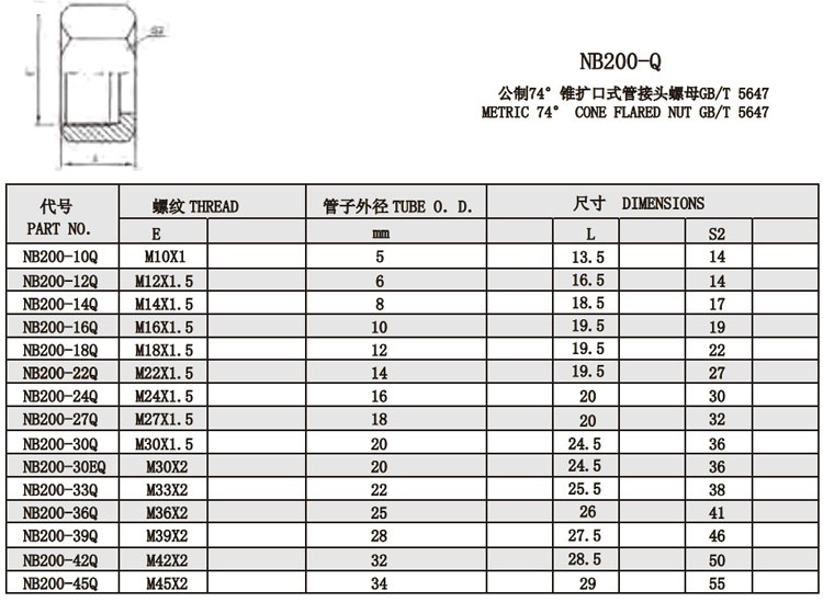 NB500-10Q,NB500-12Q,NB500-14Q,NB500-16Q,NB500-18Q,NB500-22Q,NB500-24Q,NB500-27Q,錐擴口式管接頭