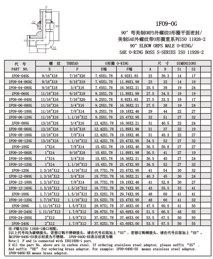 1F09-040G,1F09-060G,1F09-080G,1F09-120G,1F09-160G,1F09-200G,美螺紋O形圈密封接頭