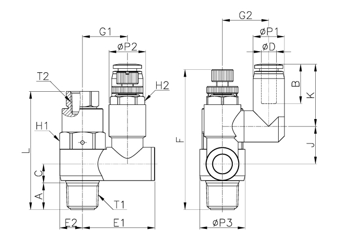 | Model | ∅D | A | T1 | T2 | B | ∅P1 | ∅P2 | ∅P3 | C | L | E1 | E2 | F/MIN | F/MAX | G1 | G2 | J | K | H1(Hex) | H2(Hex) | WEIGHT(g) | BOX(EA) |
