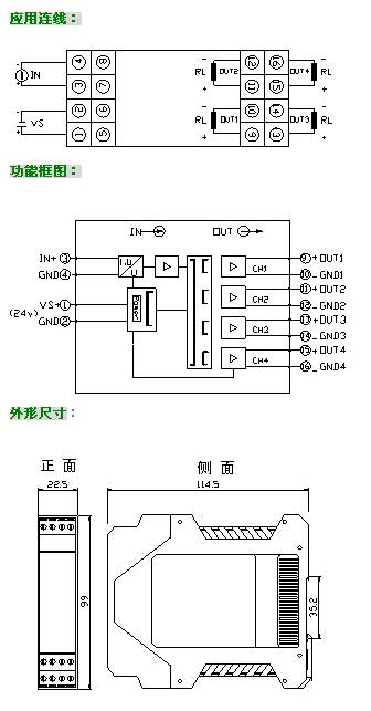 例:輸入4-20mA, 輸出4路信號:4-20mA,供電24VDC