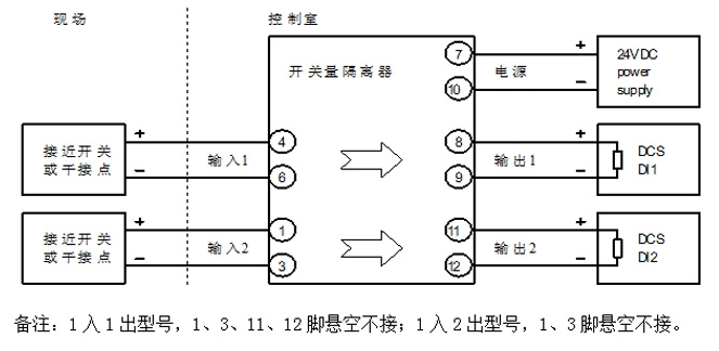 MIK-508E開(kāi)關(guān)量隔離器接收來(lái)自現場(chǎng)的開(kāi)關(guān)信號,如接近開(kāi)關(guān)的信號,隔離后輸出??蛇x1入1出、1入2出、2入2出。