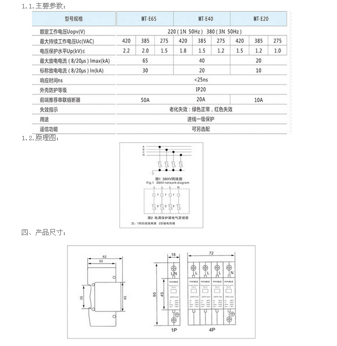 MT-E20電涌保護器(以下簡(jiǎn)稱(chēng)E20)適用于交流50/60Hz,額定電壓380V的IT、TT、TN-C、TN-S、TN-C-S等供電系統,對間接雷電和直接雷電影響或其他瞬時(shí)過(guò)電壓的電涌進(jìn)行保護。依據IEC61643-1:1998-02標準。