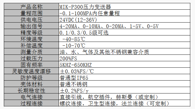 MIK-P300壓力變送器壓力敏感核心采用了高性能的硅壓阻式壓力充油芯體,內部的專(zhuān)用集成電路將傳感器毫伏信號轉換成標準電壓、電流或頻率信號,可以直接與計算機電路接口卡、控制儀表、智能儀表會(huì )PLC等方便相連。遠距離傳輸可以采用電流輸出方式。具有體積小、重量輕、全不銹鋼密封結構,可在腐蝕性環(huán)境中工作。該產(chǎn)品安裝方便簡(jiǎn)潔,具有極高的抗震和抗沖擊性能。