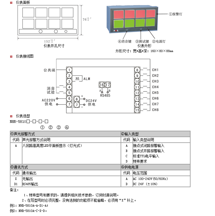 NHR-5810系列八路閃光報警器是一種接點(diǎn)式聲光報警顯示儀表,具有電路簡(jiǎn)單、元件少、可靠性高、抗干擾能力強、低功耗、低噪聲、EMC電磁兼容等特點(diǎn),廣泛運用于電力、石化、冶金、輕工、制藥、航空等諸多領(lǐng)域。 |