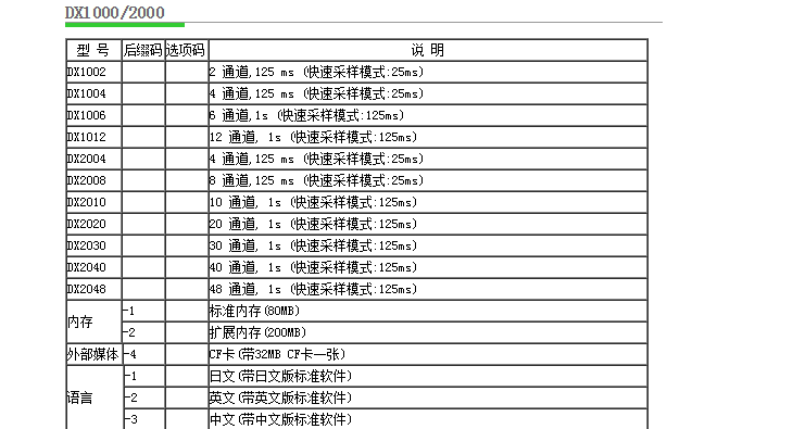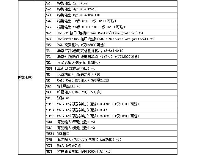 | *1 /A1,/A2,/A3,/A4,/A5以及/F2不能同時(shí)選用 *2 /A3和/F1不能同時(shí)選用(僅對DX100), /A5和/F1不能同時(shí)選用(僅對DX200) *3 /C2,/C3以及/CF1不能同時(shí)選用 *4 /H5[ ] D:電源插口 UL,CSA 標準 F:電源插口 VDE 標準 R:電源插口 SAA 標準 J:電源插口 BS 標準 H:電源插口 GB 標準 *5 DX1002,DX1004,DX2004,DX2008 不能選用/N2 *6 選用了/TPS2, 就不能選用 /TPS4, /A2, /A3或 /F1(僅對DX1000) *7 DX1000: 選用了/TPS4, 就不能選用 /TPS2, /A1, /A2, /A3或 /F1 DX2000: /TPS4, /TPS8, /A5, /F2不能同時(shí)指定 *8 選用了/TPS8, 就不能同時(shí)選用/F1和/A4 *9 /KB1, /KB2不能同時(shí)指定,指定/KB1時(shí),附帶1臺遙控器(438227) *10 DX1000: 指定/PM1時(shí),不能指定/A3, /M1, /R1, /TPS2, /TPS4。另外/A2, /F1不能同時(shí)指定 DX2000: 指定/PM1時(shí),不能指定/A5, /F2, /M1, /R1。另外/A2, /F1和/A4, /TPS8不能同時(shí)指定 *11 只能對DX2010,DX2020,DX2030,DX2040,DX2048指定/MC1 |