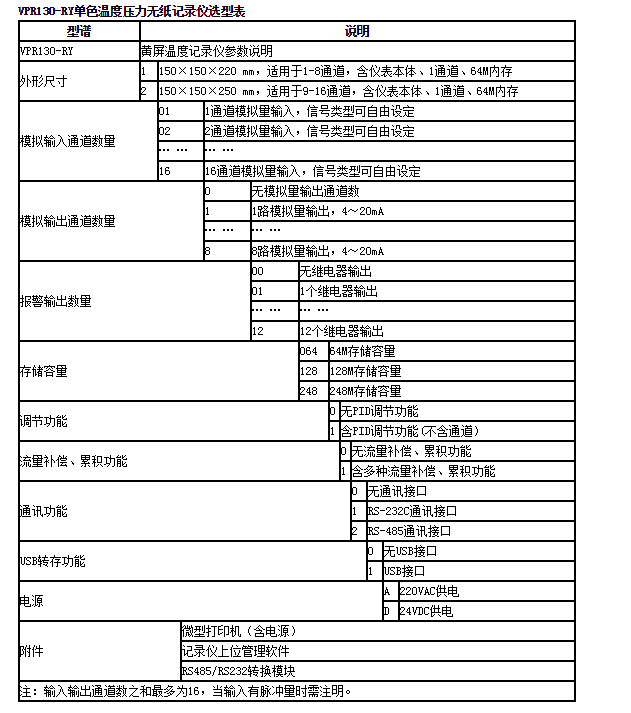 VPR130-RY單色溫度壓力無(wú)紙記錄儀以32位嵌入式CPU為核心,并輔以大規模集成電路、大容量FLASH存儲、信號智能調理、SmartBus總線(xiàn)以及高分辨率圖形液晶顯示器的新型智能化無(wú)紙記錄類(lèi)儀表。公司產(chǎn)品采用320×234真彩TFT液晶顯示屏;支持16路模擬量萬(wàn)能輸入、8路模擬輸出、12路報警輸出、16路全隔離24VDC配電輸出,設定數據與記錄數據具掉電保護功能。具有功耗低、精度高、體積小、通道數多、通用性強、可靠性高、運行穩定等特點(diǎn)。儀表采用USB Host技術(shù),支持USB 移動(dòng)存儲器的數據讀寫(xiě);采用RS-232C/RS-485通訊接口,支持標準MODBUS-RTU協(xié)議,可方便實(shí)現遠程監控。