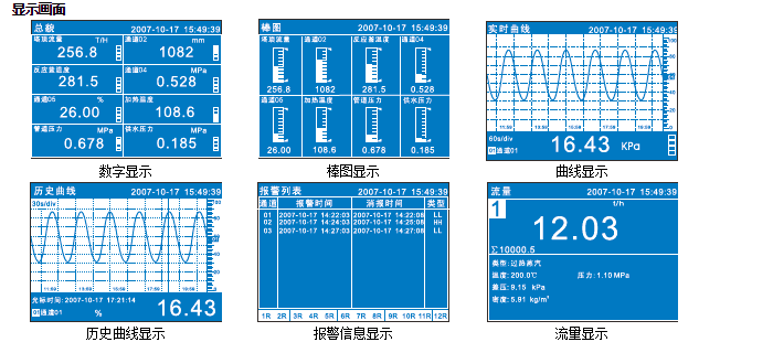◎同時(shí)指示各路通道的下下限、下限、上限、上上限報警??梢杂涗洸@示最近的15條報警信息。